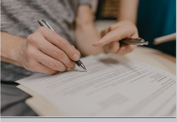 Alt-text: a lawyer standing with a client, getting them to sign documents placed on a wooden table